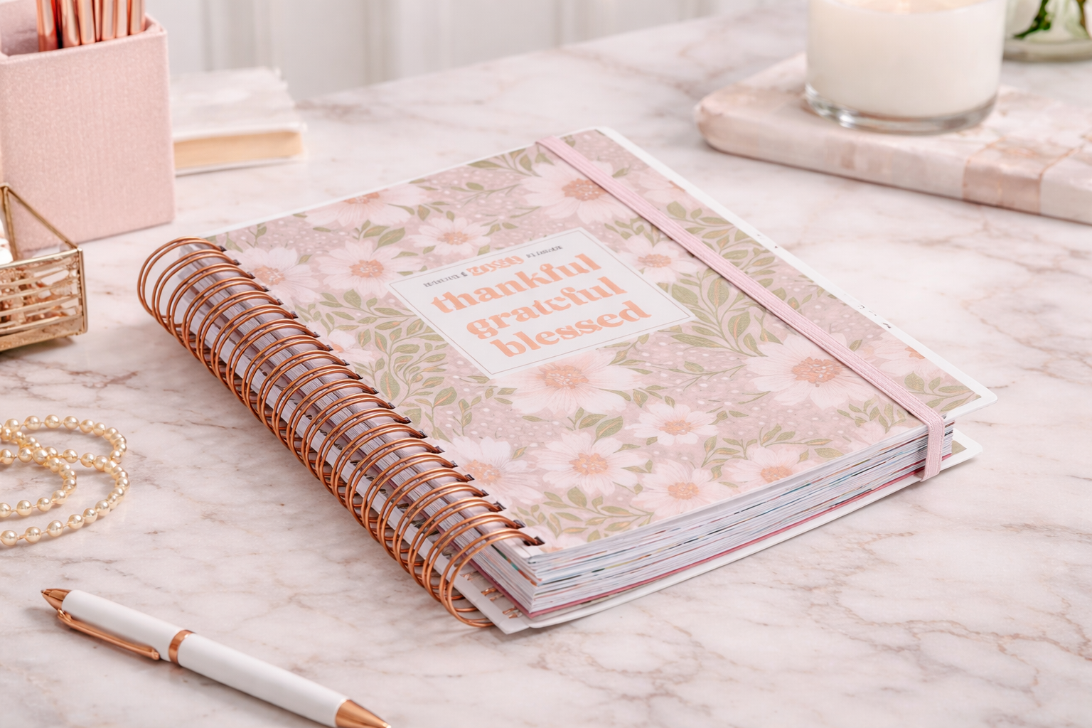 Each week is gently uplifted with inspirational quotes, encouraging a heart of gratitude and intentional living throughout the year. The durable wire binding allows the planner to lay flat, while the elastic band closure keeps everything secure on the go.